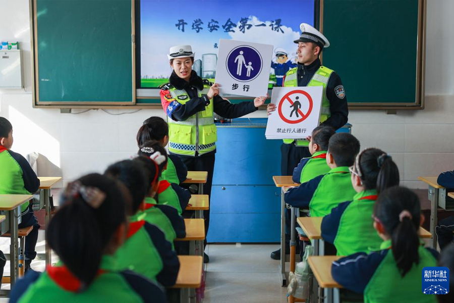1/02月26日,在山東省榮成市府新小學(xué)教室內(nèi),交警在學(xué)期第一天為學(xué)生講解各類(lèi)道路交通安全標(biāo)識(shí)。(新華社發(fā) 李信君/攝)