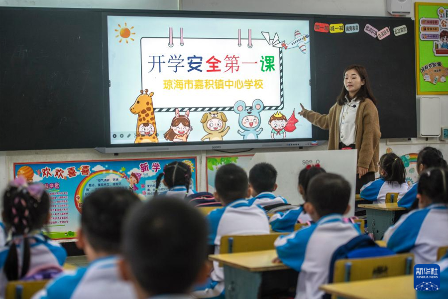 1/02月26日,海南省瓊海市嘉積鎮(zhèn)中心學(xué)校第三小學(xué)的老師在開(kāi)學(xué)第一課上為學(xué)生進(jìn)行安全教育。(新華社發(fā) 蒙鐘德/攝)