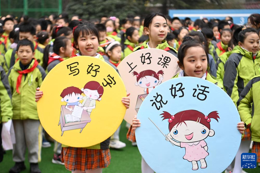 1/02月26日,西安市未央?yún)^(qū)方新小學(xué)的學(xué)生在開(kāi)學(xué)典禮上。(新華社記者 鄒競(jìng)一/攝)
