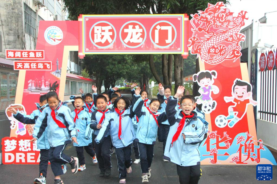 1/02月26日,南寧市華衡小學(xué)學(xué)生在開(kāi)學(xué)儀式上“魚(yú)躍龍門(mén)”,開(kāi)啟新學(xué)期。(新華社發(fā) 王馨苑/攝)