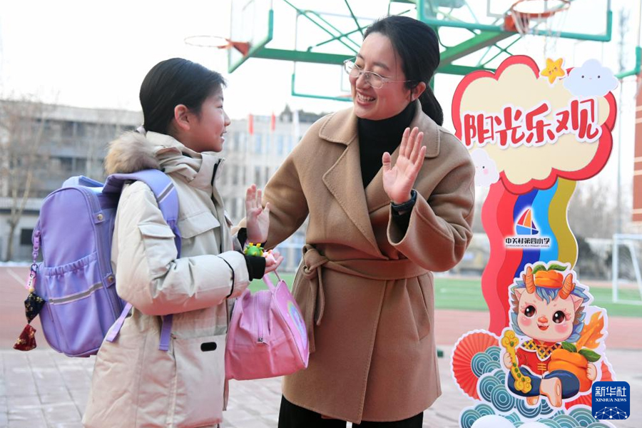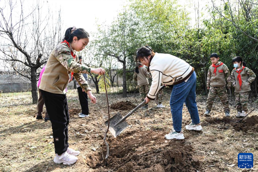 1/03月11日,在河南省濟(jì)源市坡頭鎮(zhèn)第三小學(xué),學(xué)生與老師一起栽植小樹苗。(新華社發(fā) 苗秋鬧/攝)