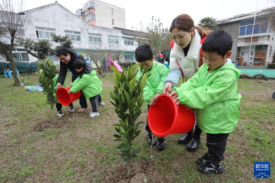 1/03月11日,在山東省高密市鳳鳴實(shí)驗(yàn)幼兒園,孩子們和老師一起在校園里栽種樹木。植樹節(jié)即將來臨,各地開展植樹活動(dòng),為大自然增添新綠。(新華社發(fā) 李海濤/攝)
