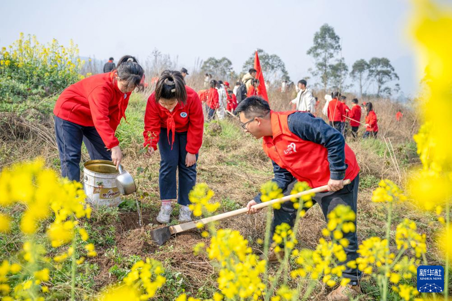 1/03月11日,在重慶市南川區(qū)西城街道永合社區(qū),學(xué)生和青年志愿者一起植樹。(新華社發(fā) 瞿明斌/攝)