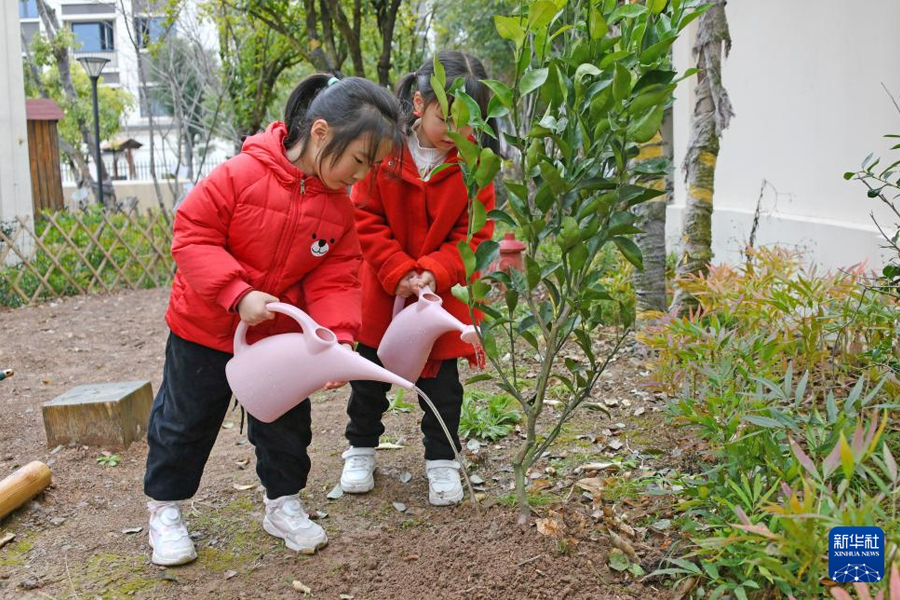 1/03月11日,浙江省臺(tái)州市仙居縣中心幼兒園的孩子們給樹苗澆水。(新華社發(fā) 王華斌/攝)