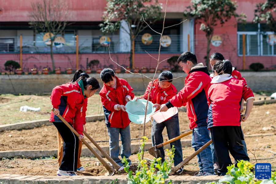 1/03月11日,學(xué)生在貴州省黔西市惠風(fēng)學(xué)校勞動(dòng)基地植樹。(新華社發(fā) 范暉/攝)
