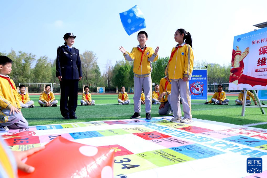 1/04月12日,在山東省聊城市茌平區(qū)第二實驗小學(xué),學(xué)生在民警的指導(dǎo)下參與國家安全主題的飛行棋闖關(guān)比賽。(新華社發(fā) 馬紅坤/攝)
