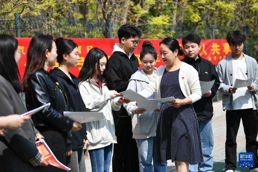 1/04月12日,在河北邯鄲學(xué)院校園內(nèi),教師和在校大學(xué)生一起學(xué)習(xí)全民國家安全教育相關(guān)知識。(新華社發(fā) 胡清華/攝)