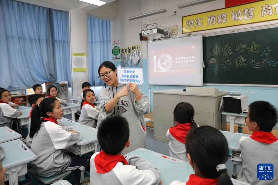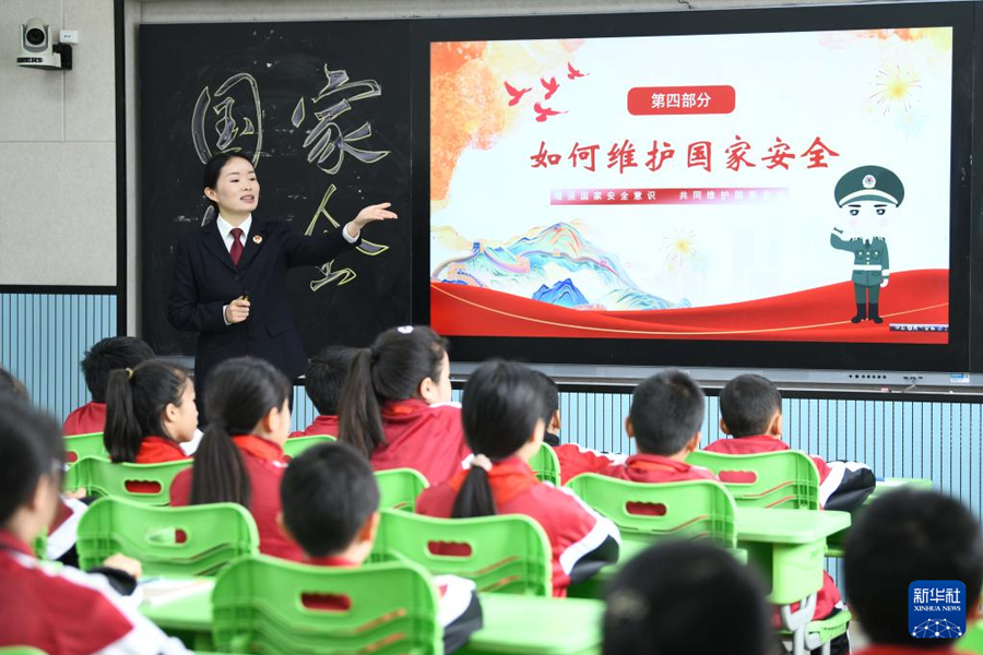 1/04月11日,浙江省東陽市江北小學(xué)教育集團(tuán)月亮灣校區(qū)的學(xué)生在課堂上學(xué)習(xí)國家安全相關(guān)知識。(新華社發(fā) 包康軒/攝)