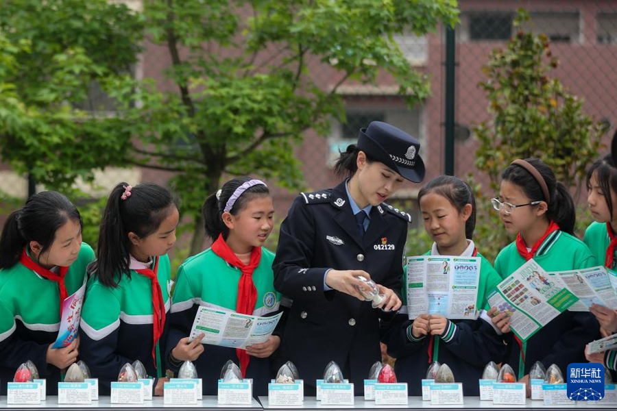 1/04月12日,民警在貴州省貴陽市烏當(dāng)區(qū)實驗小學(xué)禁毒園地為學(xué)生講解禁毒知識。(新華社發(fā) 袁福洪/攝)