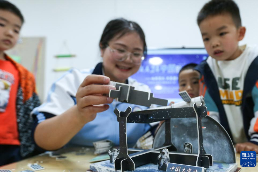 1/04月24日,貴州省都勻市青云湖幼兒園的老師和孩子們一起拼裝空間站模型。(新華社發(fā) 肖偉/攝)