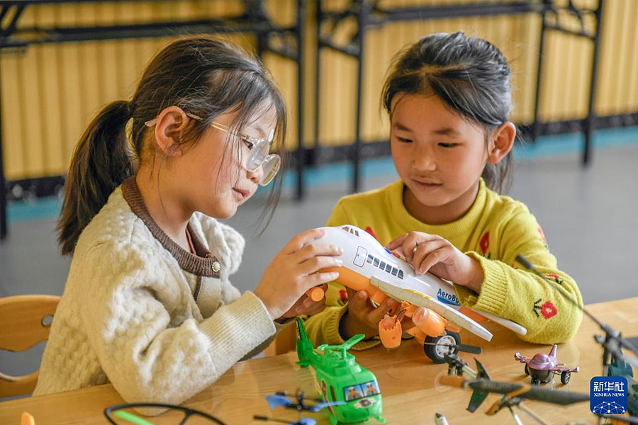 1/04月24日,河北省遵化市東新莊鎮(zhèn)中心幼兒園的小朋友在觀看飛機(jī)模型。(新華社發(fā) 劉滿倉/攝)