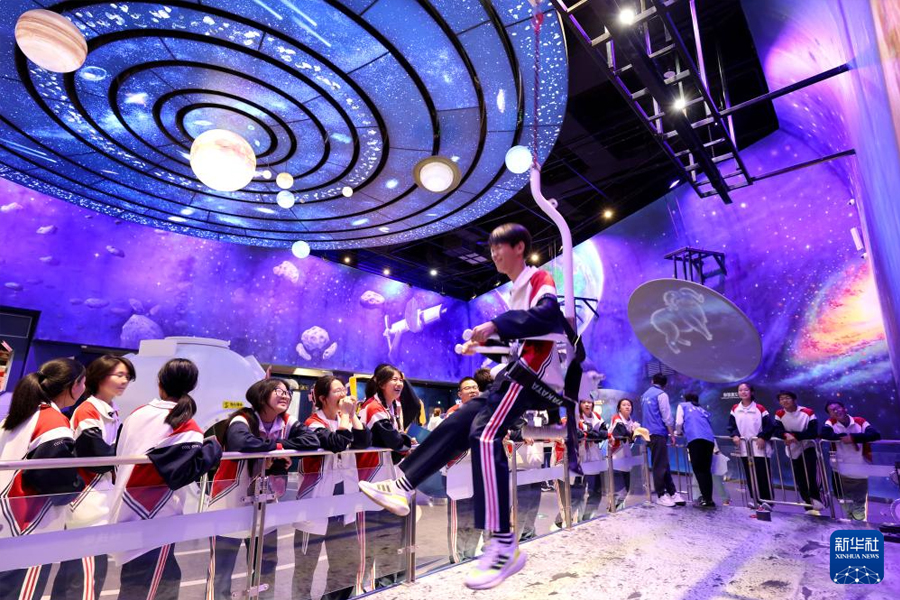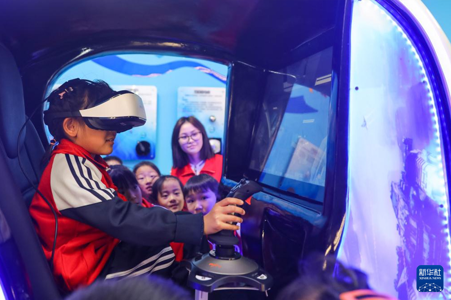 1/04月24日,在山東省青島市李滄區(qū)世園街道金水東路社區(qū)新時代文明實踐站太空科普館,學(xué)生利用VR設(shè)備模擬體驗太空飛行。(新華社發(fā) 張鷹/攝)