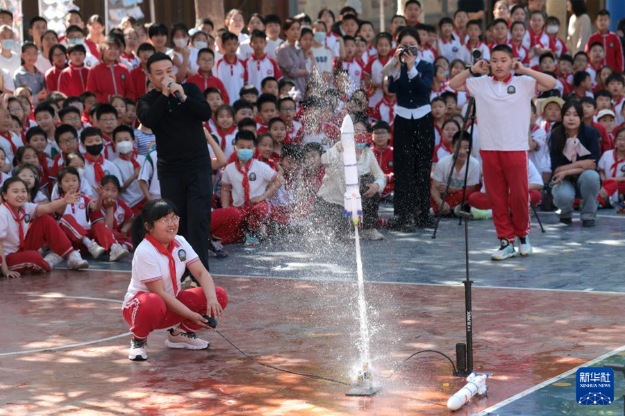 1/04月24日,在河北省石家莊市中華大街小學(xué)科技節(jié)活動中,學(xué)生進(jìn)行“水火箭”展示。(新華社發(fā) 梁子棟/攝)