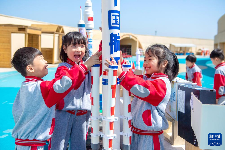 1/04月24日,浙江省湖州市長興縣泗安鎮(zhèn)中心幼兒園孩子在體驗用廢舊材料制作的航天主題作品。(新華社發(fā) 譚云俸/攝)
