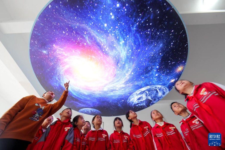 1/04月24日,在貴州省開陽縣東湖小學(xué)航天科普園地,老師給學(xué)生科普航天知識。(新華社發(fā) 袁福洪/攝)