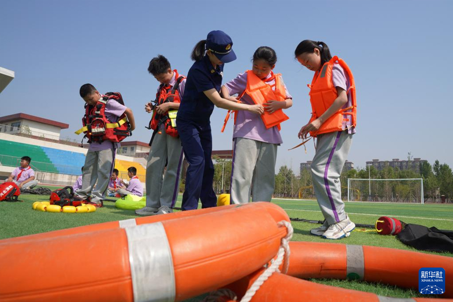 1/05月9日,在河北省邢臺(tái)市內(nèi)丘縣朝陽(yáng)小學(xué),消防救援大隊(duì)工作人員指導(dǎo)學(xué)生穿戴救生衣。(新華社發(fā) 劉繼東/攝)