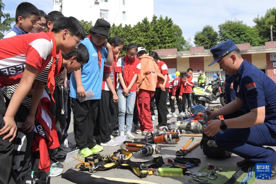 1/05月9日,安徽省合肥市蜀山區(qū)“平安建設(shè)校園行”活動(dòng)在樂(lè)農(nóng)新村小學(xué)奧林校區(qū)啟動(dòng),蜀山區(qū)消防救援大隊(duì)消防員向?qū)W生介紹救援器械。(新華社發(fā) 陳三虎/攝)
