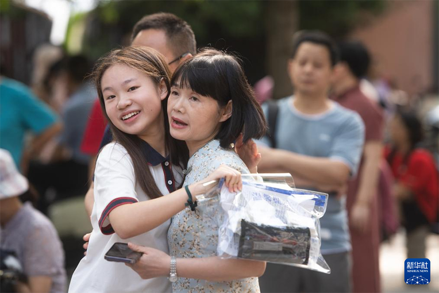 1/06月7日,在湖北省武漢市第十四中學考點,一名考生與送考家長擁抱。(新華社記者 伍志尊/攝)