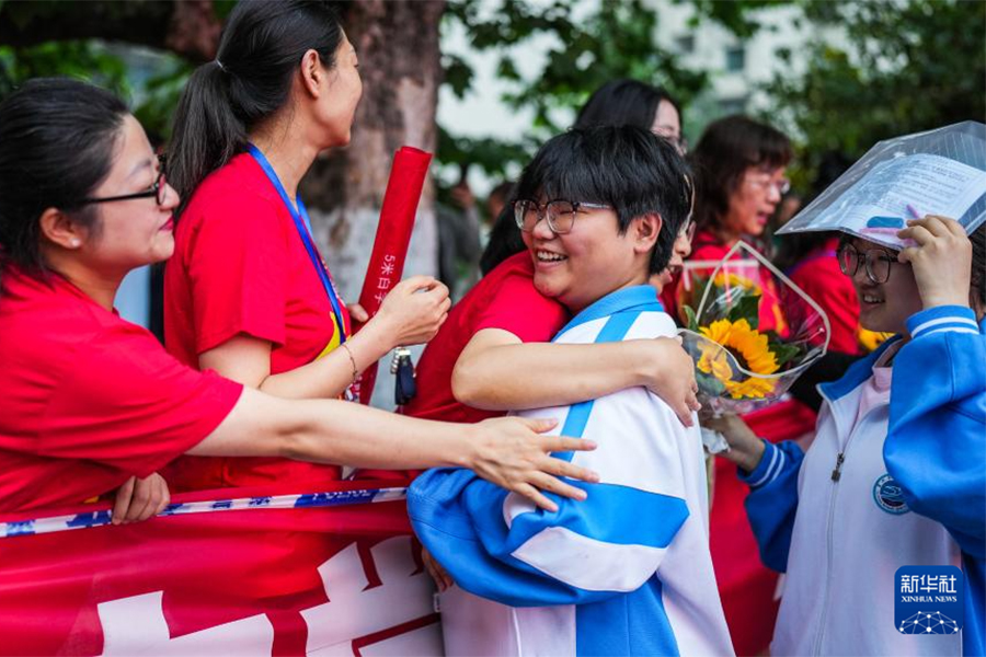 1/06月7日,考生在貴州貴陽市烏當中學考點和送考老師擁抱加油。(新華社記者 陶亮/攝)