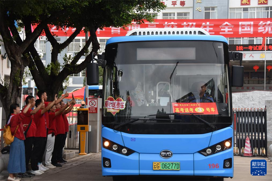 1/06月7日,在云南省紅河哈尼族彝族自治州蒙自市第一高級中學(文科)考點,老師為學生加油打氣,愛心送考車送考生到紅河州第一中學(理科)考點參加高考。(新華社發(fā) 薛瑩瑩/攝)