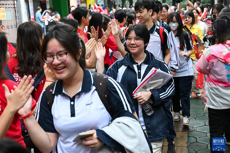 1/06月7日,考生在廣東省廣州市鐵一中學考點與送考老師擊掌。(新華社記者 劉大偉/攝)