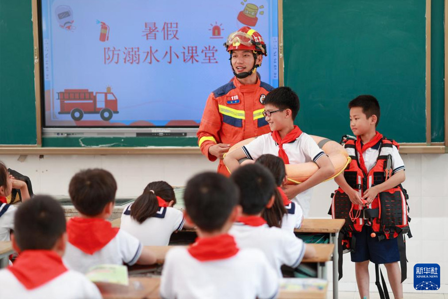 1/06月24日,湖南省常寧市宜城小學(xué)的老師在向?qū)W生講授如何正確使用救生圈。暑假臨近,各地中小學(xué)校開(kāi)展暑假安全教育活動(dòng),增強(qiáng)學(xué)生的安全意識(shí)和自我防護(hù)能力,幫助學(xué)生平安快樂(lè)度暑假。(新華社發(fā) 周秀魚(yú)春/攝)