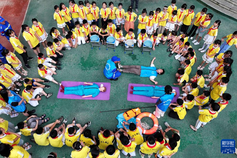 1/06月24日,在湖南省衡陽(yáng)市雁峰區(qū)環(huán)城南路小學(xué),南華大學(xué)體育學(xué)院防溺水安全知識(shí)宣講團(tuán)的志愿者們指導(dǎo)小學(xué)生們學(xué)習(xí)防溺水自救互救的基本知識(shí)與技能(無(wú)人機(jī)照片)。(新華社發(fā) 曹正平/攝)