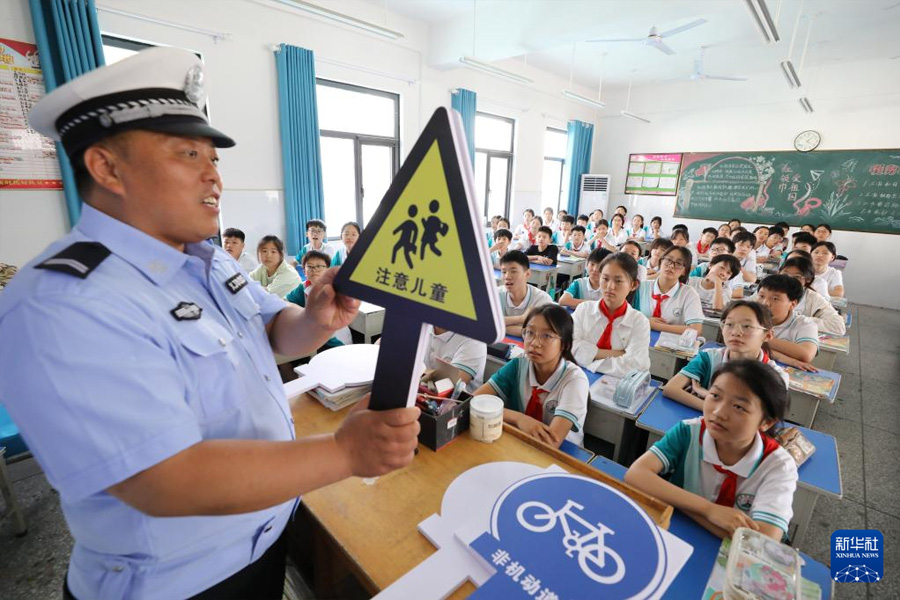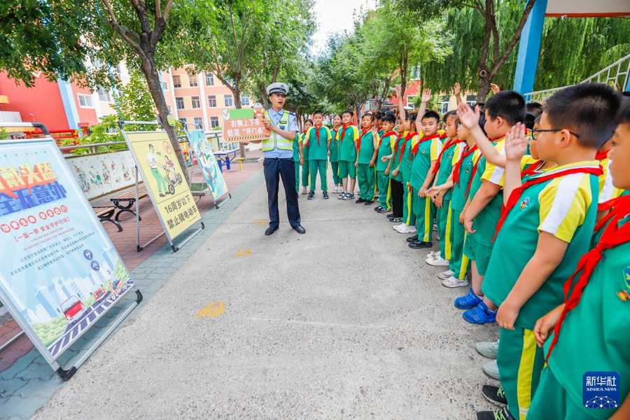 1/06月24日,民警在河北省秦皇島市盧龍縣第四實(shí)驗(yàn)小學(xué)向?qū)W生講解交通安全知識(shí)。(新華社發(fā) 劉滿倉(cāng)/攝)