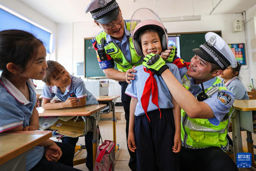 1/06月24日,在山東省榮成市府新小學(xué),民警指導(dǎo)小學(xué)生正確佩戴安全頭盔。(新華社發(fā) 李信君/攝)