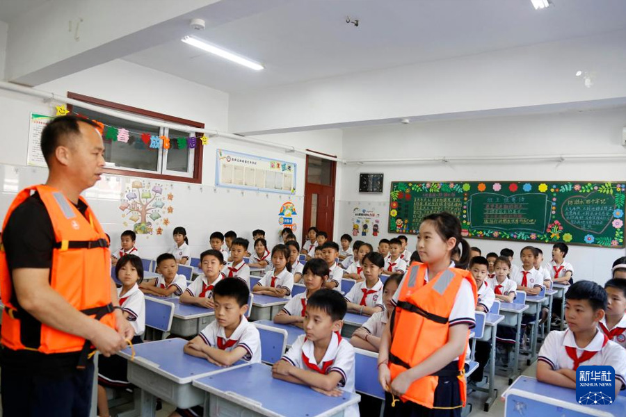 1/06月24日,湖南省常寧市宜城小學(xué)的老師在指導(dǎo)學(xué)生正確使用救生衣上的救生哨子。(新華社發(fā) 周秀魚(yú)春/攝)