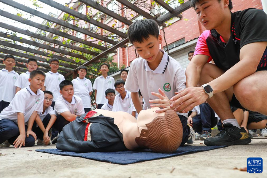 1/06月24日,在湖南省衡陽(yáng)市衡陽(yáng)縣弘揚(yáng)中學(xué),老師在給學(xué)生講解心肺復(fù)蘇知識(shí)。(新華社發(fā) 劉欣榮/攝)
