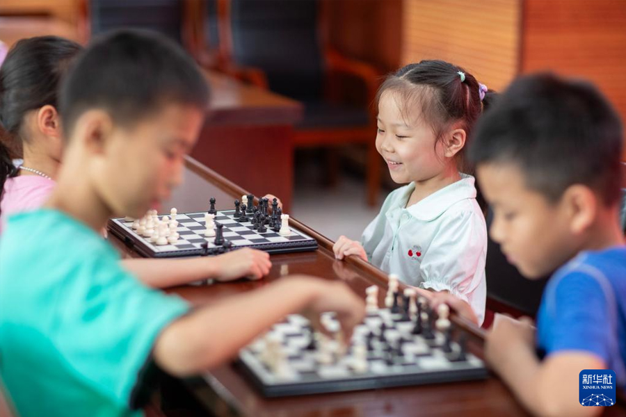 1/07月10日,在江蘇省興化市昭陽街道長安社區(qū)新時代文明實(shí)踐站,孩子們在體驗(yàn)國際象棋。(新華社發(fā) 周社根/攝)