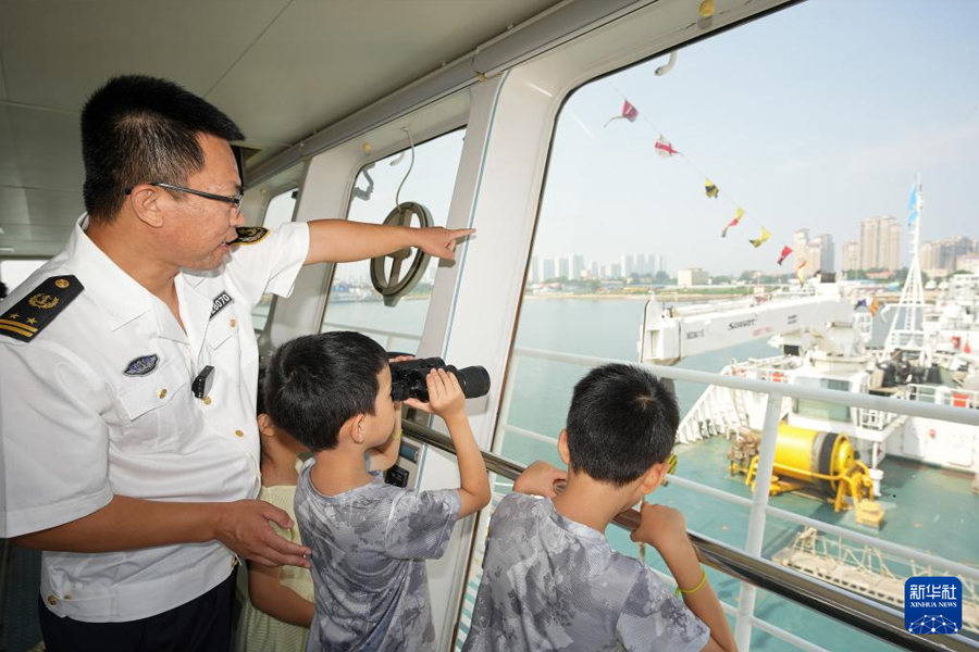 1/07月11日,在位于山東煙臺的交通運(yùn)輸部北海航海保障中心煙臺航標(biāo)處,“海巡153”航標(biāo)船上的船員為小朋友介紹航海知識。(新華社發(fā) 唐克/攝)