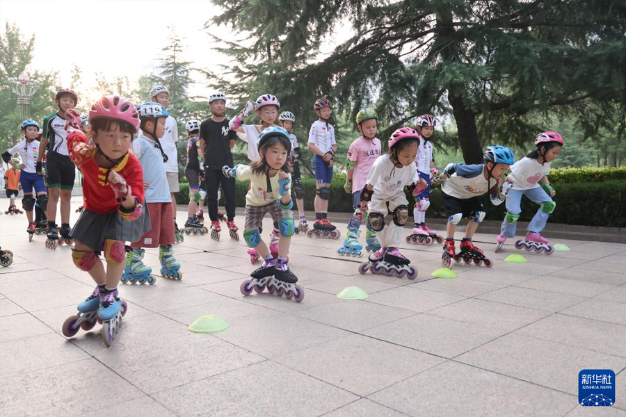 1/07月11日,小朋友在山東省臨沂市人民廣場練習(xí)輪滑。(新華社發(fā) 許傳寶/攝)