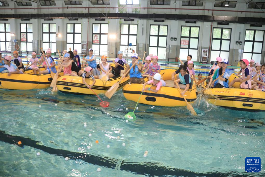 1/07月11日,在浙江海洋大學(xué)游泳館,小朋友參加大黃艇抓“鴨子”趣味比賽。(新華社發(fā) 陳永建/攝)