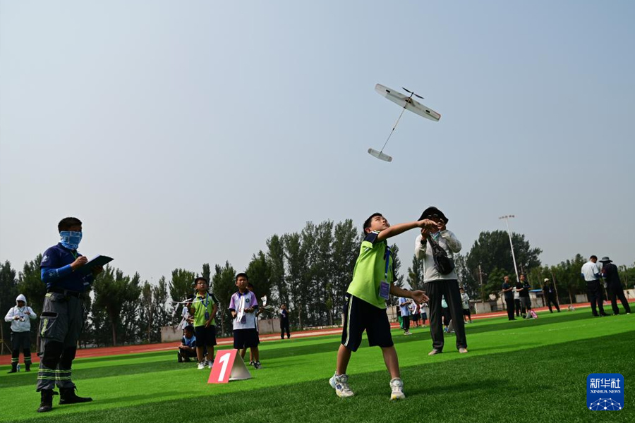 1/07月11日,小朋友們在山東省聊城市參加橡筋動力飛機(jī)競時賽。(新華社發(fā) 張振祥/攝)