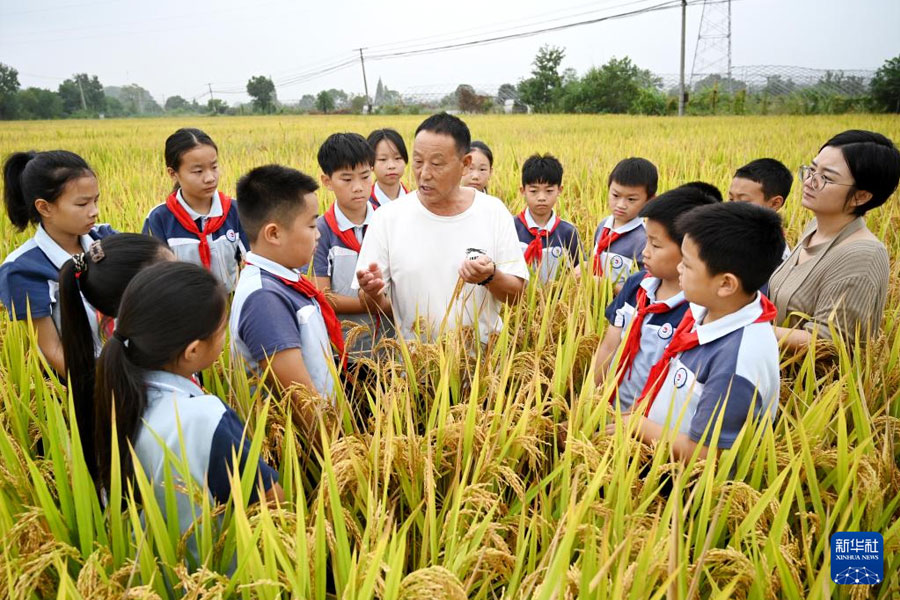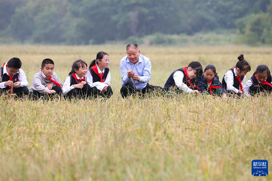 1/010月16日,山東省臨沂市沂南縣張莊鎮(zhèn)中心小學(xué)的學(xué)生在老師的帶領(lǐng)下學(xué)習(xí)水稻知識(shí)。當(dāng)日是世界糧食日,各地開展主題教育活動(dòng),增強(qiáng)孩子們愛惜糧食、節(jié)約糧食的意識(shí)。(新華社發(fā) 王彥冰/攝)