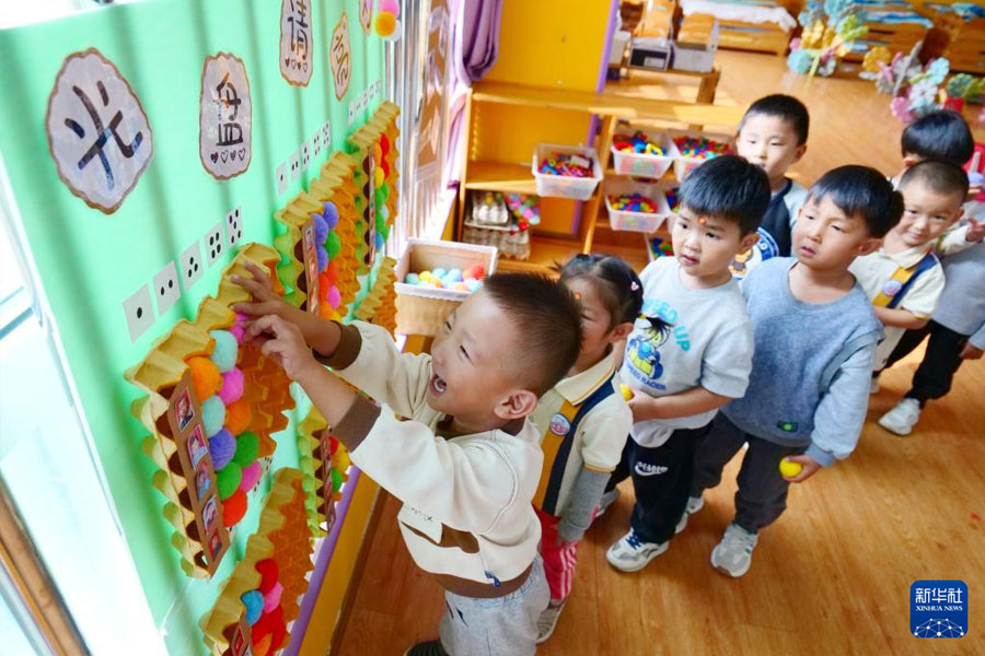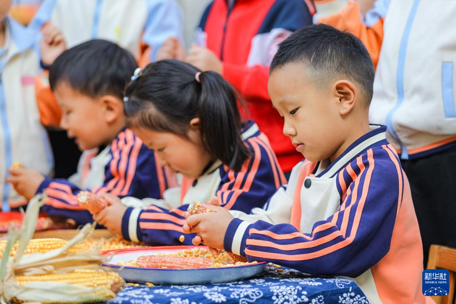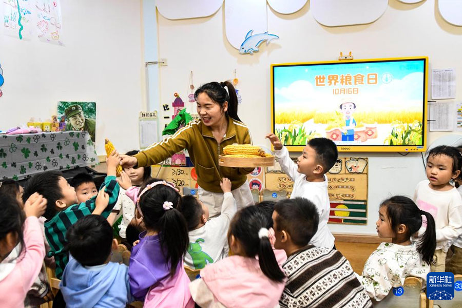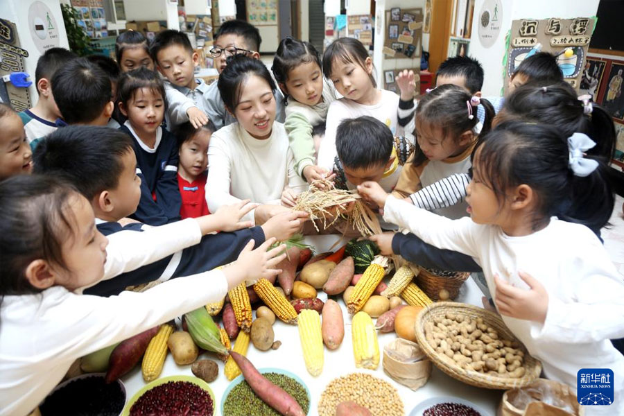 1/010月16日,在河南省濟(jì)源市愚公路幼兒園,老師教小朋友認(rèn)識(shí)糧食。(新華社發(fā) 苗秋鬧/攝)