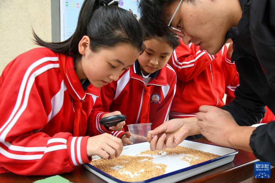 1/010月16日,在四川省閬中市,小學(xué)生在四川省儲(chǔ)備糧集團(tuán)閬中儲(chǔ)備庫工作人員的指導(dǎo)下學(xué)習(xí)挑選小麥中的不完善粒。(新華社發(fā) 王玉貴/攝)