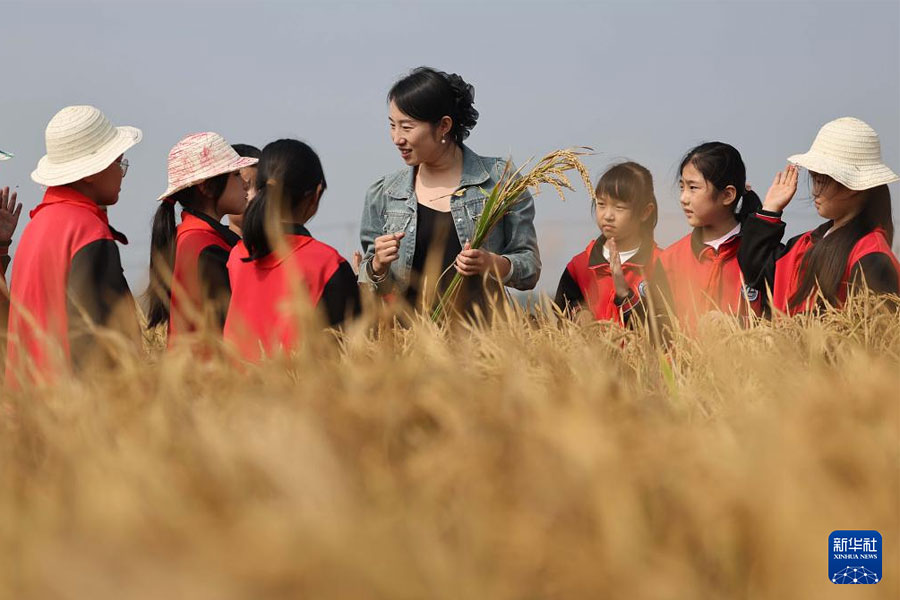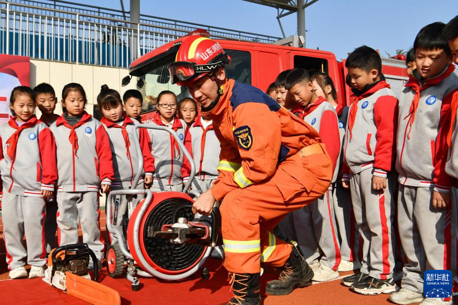 1/011月7日,在山東省棗莊市臺(tái)兒莊區(qū)蘭祺實(shí)驗(yàn)小學(xué),消防救援隊(duì)員向?qū)W生們介紹消防器材功能。(新華社發(fā) 賈禮章/攝)