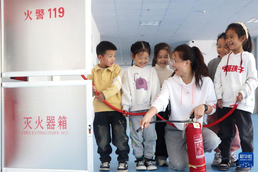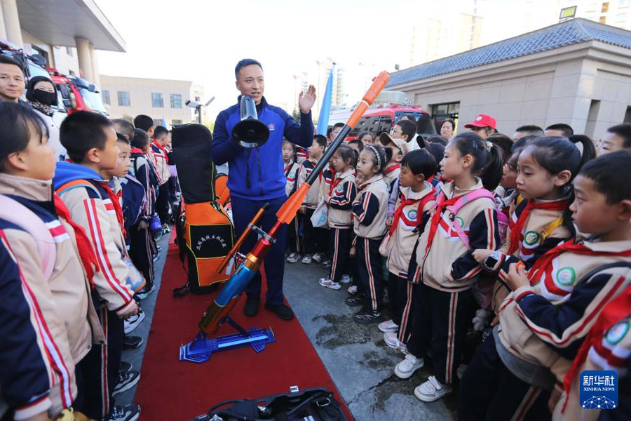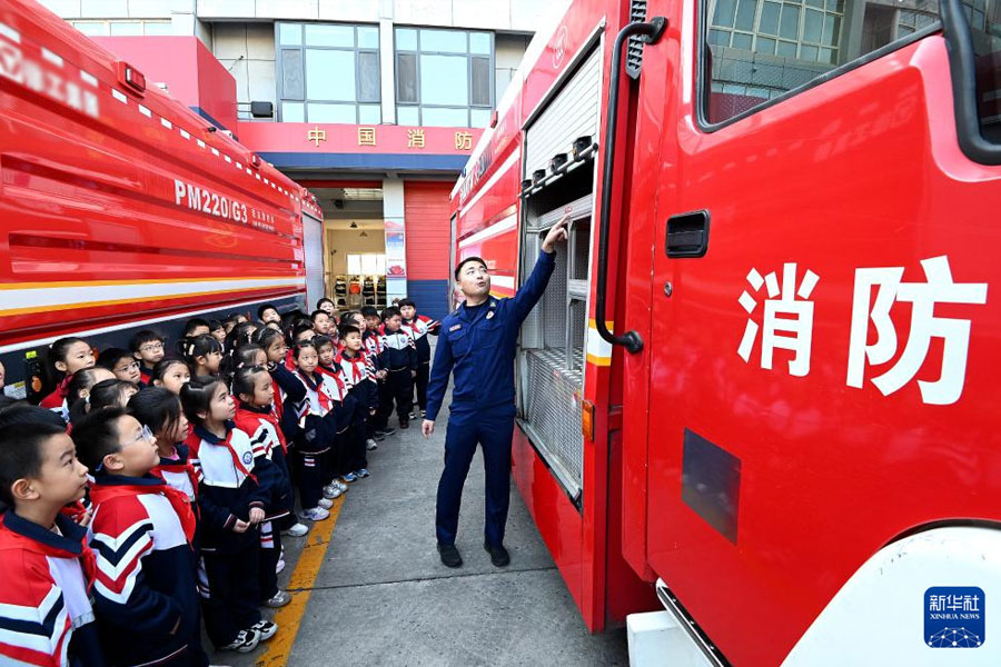 1/011月5日,河北省邯鄲市消防救援支隊(duì)特勤大隊(duì)一站的消防員為邯山區(qū)趙王小學(xué)的同學(xué)講解消防安全知識(shí)。(新華社發(fā) 郝群英/攝)