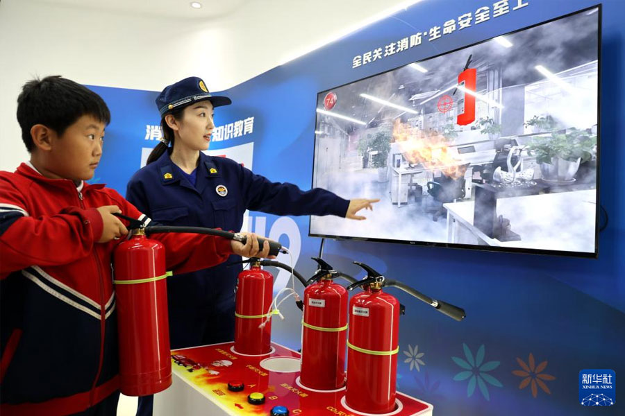 1/011月8日,在山東省濱州市陽信縣勞店鎮(zhèn)科普教育大廳,小朋友在消防救援隊(duì)員的指導(dǎo)下進(jìn)行模擬滅火訓(xùn)練。(新華社發(fā) 初寶瑞/攝)