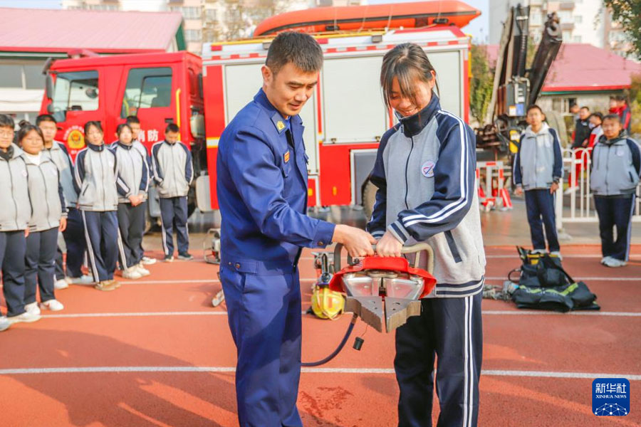 1/011月7日,河北省遵化市第二中學(xué)的學(xué)生在體驗(yàn)使用消防器材。(新華社發(fā) 劉滿倉/攝)
