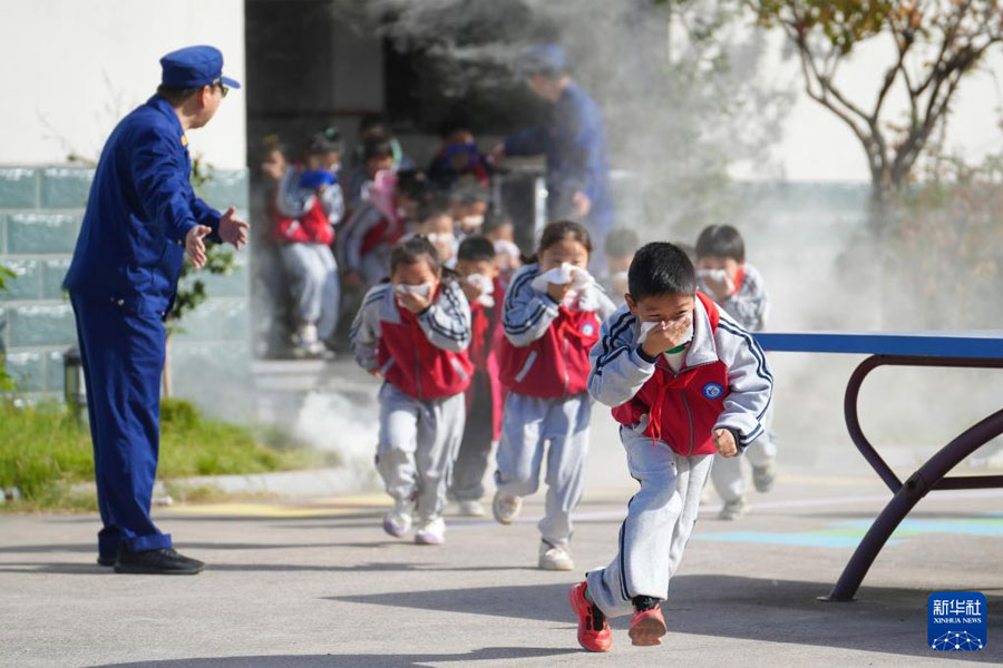 1/011月7日,浙江省湖州市德清縣鐘管鎮(zhèn)干山小學(xué),學(xué)生在消防綜合應(yīng)急救援隊(duì)消防員指導(dǎo)下進(jìn)行應(yīng)急疏散演練。(新華社發(fā) 王正/攝)