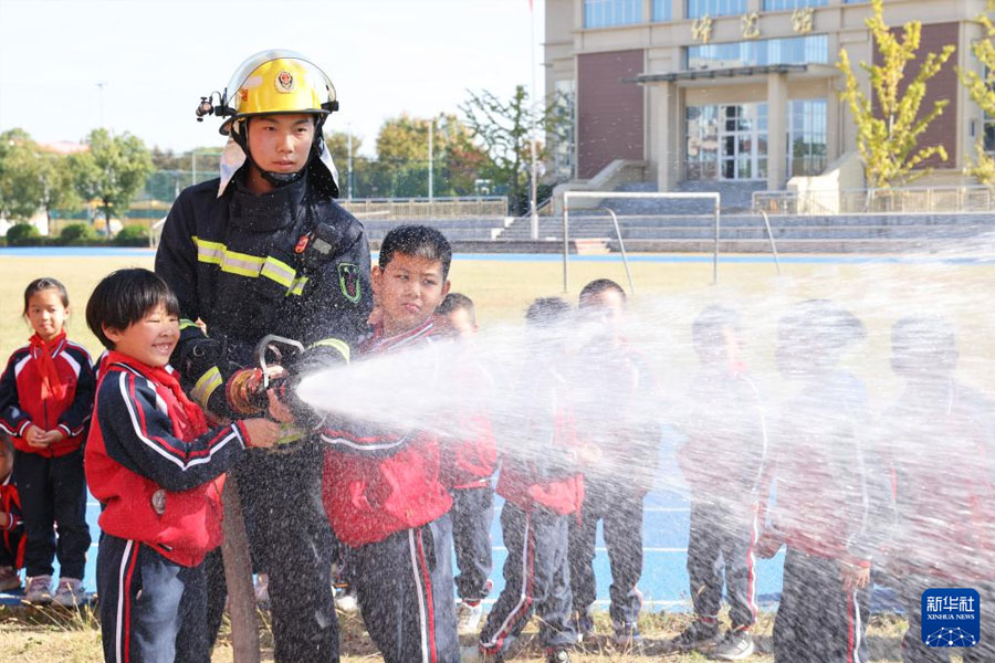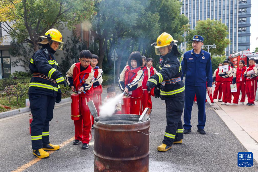 1/011月8日,在江蘇省揚(yáng)州市江都區(qū)大橋中心小學(xué),學(xué)生在江都區(qū)消防救援大隊(duì)隊(duì)員指導(dǎo)下體驗(yàn)滅火。(新華社發(fā) 任飛/攝)