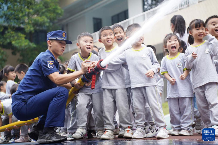 1/011月5日,在福建省龍巖市新羅區(qū)西陂街道一家幼兒園,小朋友在消防員的指導(dǎo)下體驗(yàn)消防水槍射水。(新華社發(fā) 周楊東/攝)