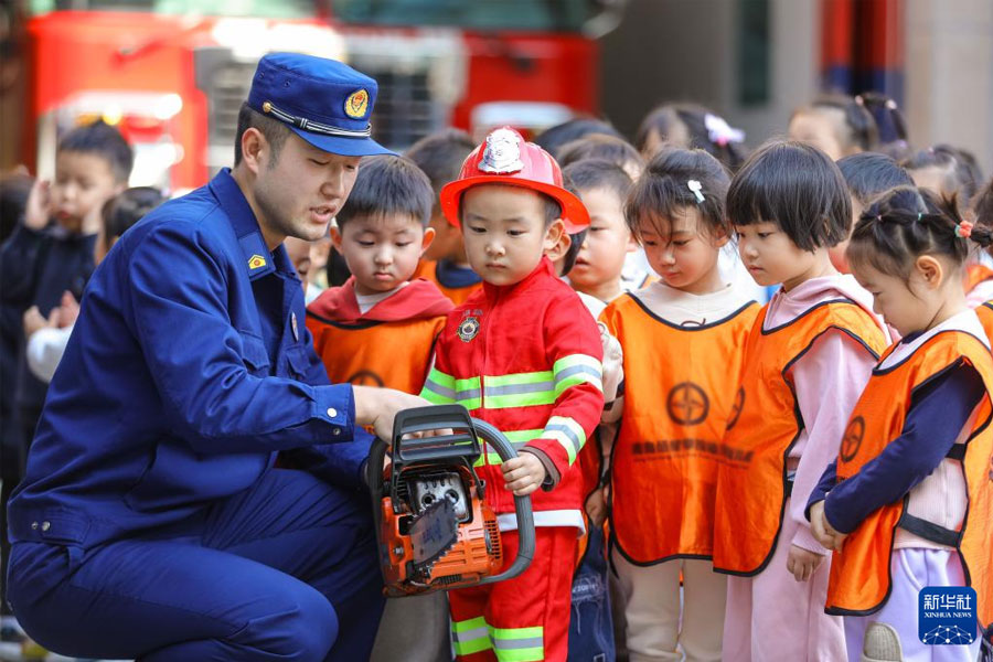 1/011月8日,在山東省青島市李滄區(qū)消防救援大隊(duì)李村站,小朋友體驗(yàn)使用消防救援器材。(新華社發(fā) 張鷹/攝)