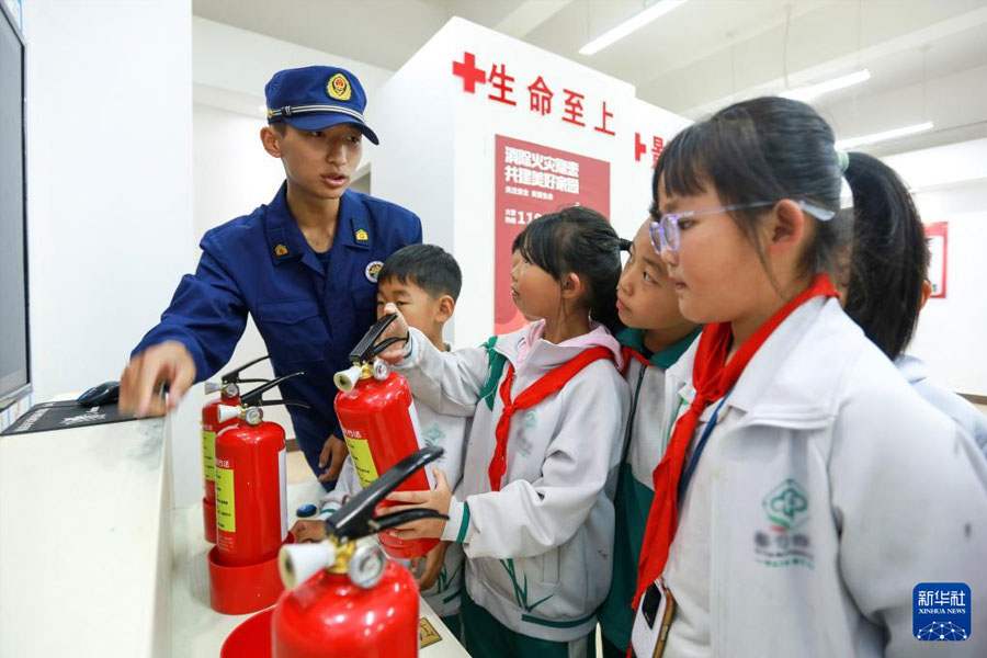 1/011月8日,在貴州省都勻市第四小學(xué)消防體驗(yàn)館,消防救援人員為同學(xué)們普及消防知識(shí)。(新華社發(fā) 肖偉/攝)