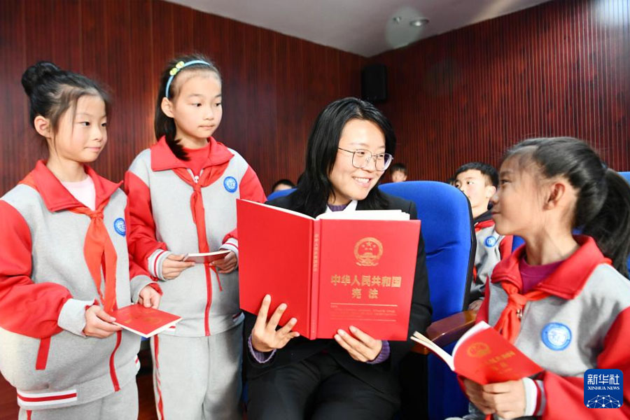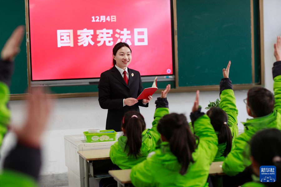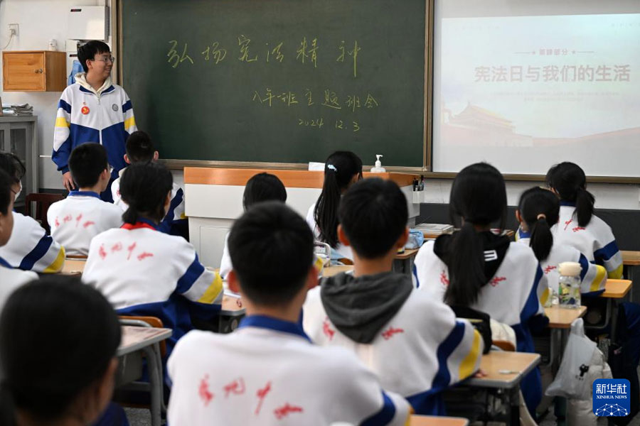 1/012月3日,天津市人民檢察院第一分院檢察干警向天津市南開區(qū)崇化中學學生普及憲法知識。今年12月4日是第十一個國家憲法日,各地開展形式多樣的活動普及憲法知識,宣傳法治觀念。2024年“憲法宣傳周”活動主題為“大力弘揚憲法精神,推動進一步全面深化改革”,時間為12月1日至7日。(新華社記者 趙子碩/攝)