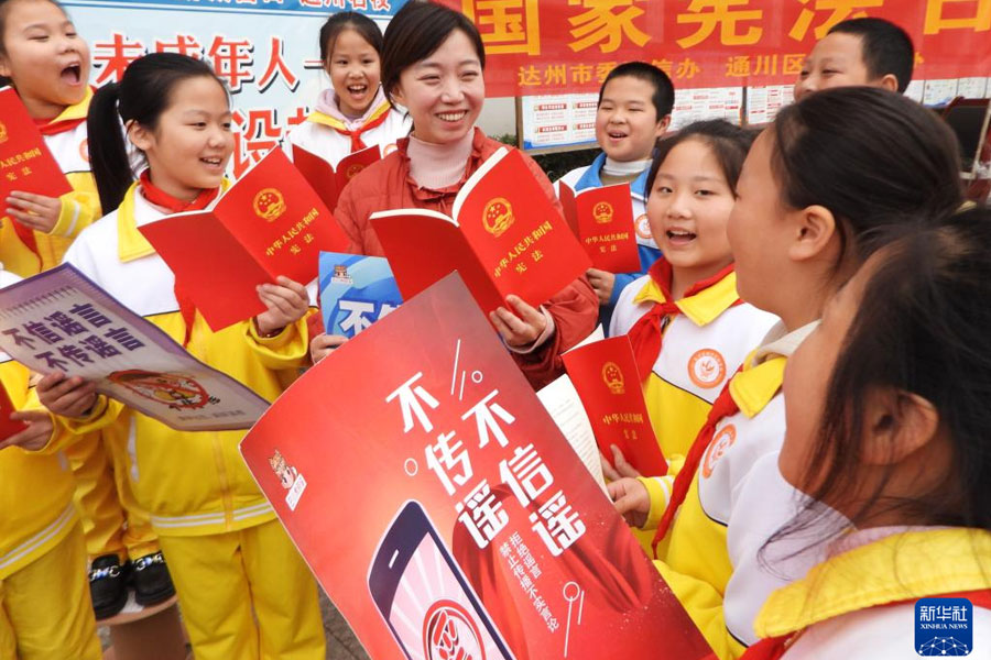 1/012月3日,在四川省達州市通川區(qū)羅江鎮(zhèn)魏興實驗學校,普法志愿者給學生講解憲法知識。(新華社發(fā) 鄧良奎/攝)